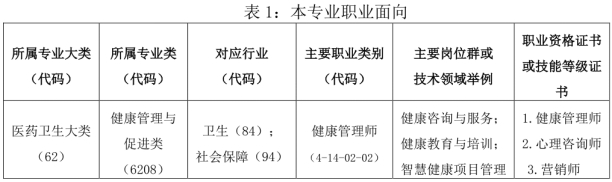 健康管理专业人才培养基于健康管理事业发展实际,根据国内外健康管理岗位需求,培养面向卫生和社会保障行业的健康管理师等职业群,能够在国际化背景下从事个人或群体健康咨询与服务、健康教育与培训和智慧项目管理等工作。本专业人才培养对应的行业、主要职业类别、主要岗位类别、职业资格证书如下表所示: