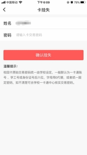 点击校园卡界面“卡挂失”,输入一卡通交易密码,可挂失校园卡。